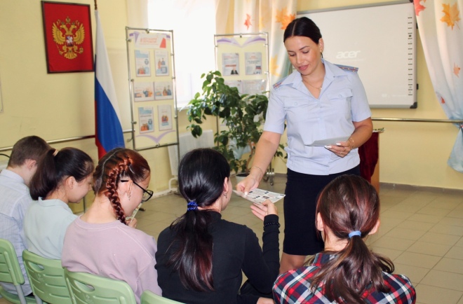 Во время мероприятия капитан полиции Елена Чемакина напомнила ребятам о видах ответственности, предусмотренных несовершеннолетним за совершение преступлений и правонарушений, в том числе в интернет-пространстве, а также разъяснила подросткам правовые последствия нарушения законодательства. Затем Елена Николаевна рассказала школьникам об основных схемах мошенничества, которые в последние годы стали особенно распространены благодаря использованию IT-технологий, и привела конкретные примеры обмана граждан из практики правоохранителей.