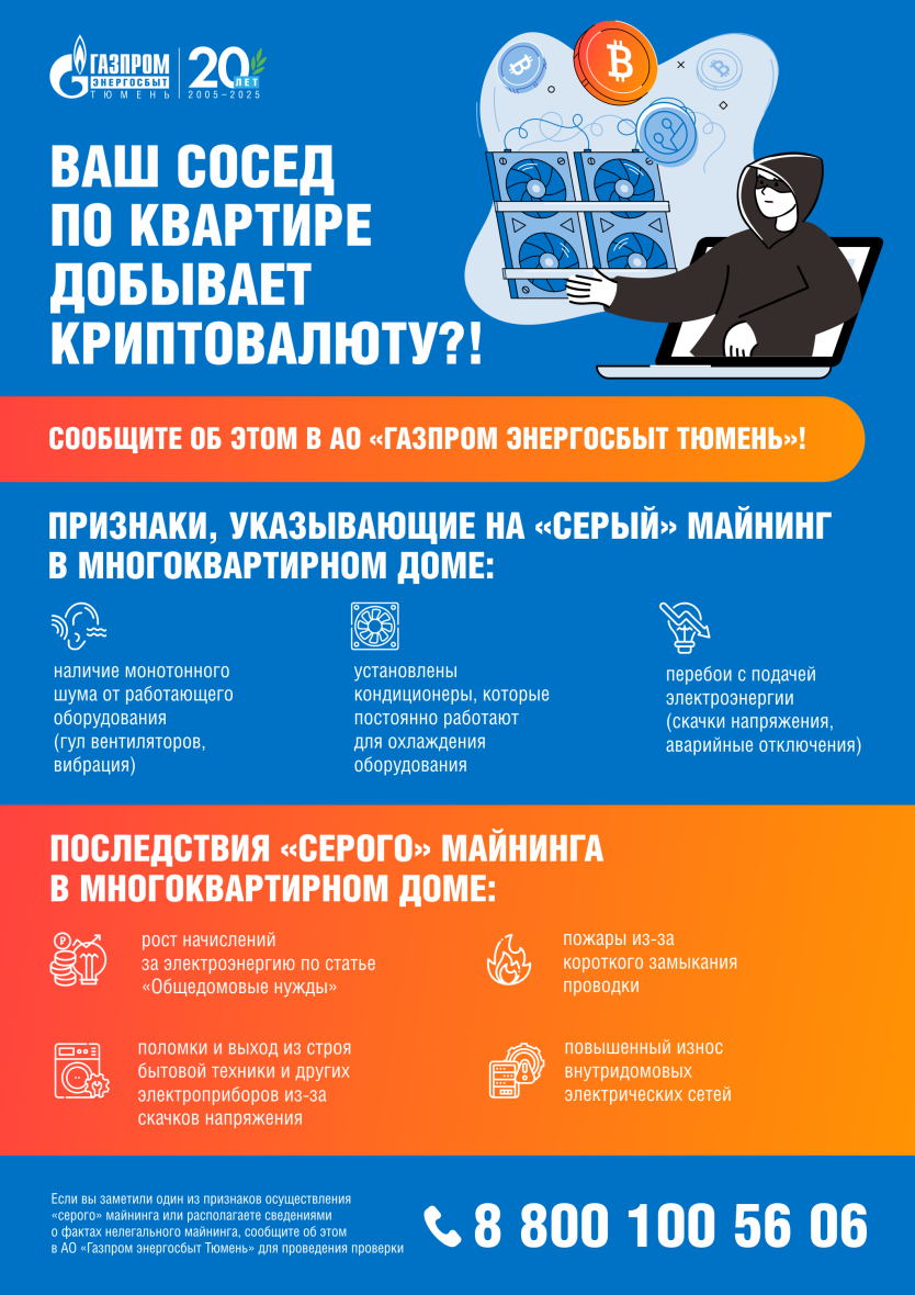 В случае выявления признаков майнинга гражданам рекомендуется незамедлительно обратиться в АО "Газпром энергосбыт Тюмень" по номеру телефона 8 (800) 100-56-06.
