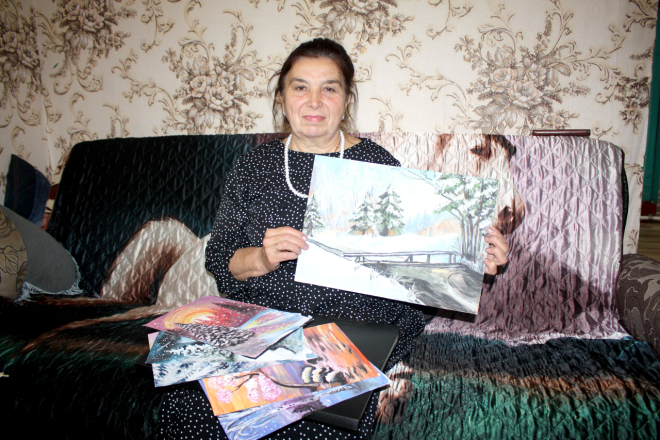 Дания Галиевна в ответ улыбается, отвечает, что за кисть и бумагу берётся только тогда, когда остаётся дома одна, когда никто не отвлекает. Показала целую серию чудесных картин, основную часть которых составляли пейзажи, выполненные акварелью.