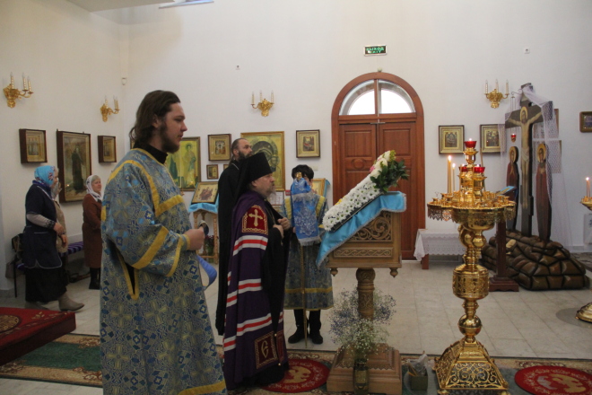 Епископа встречали настоятель Храма Покрова Божией Матери Николай Галочкин, иерей Александр Коробейников и верующие жители округа.