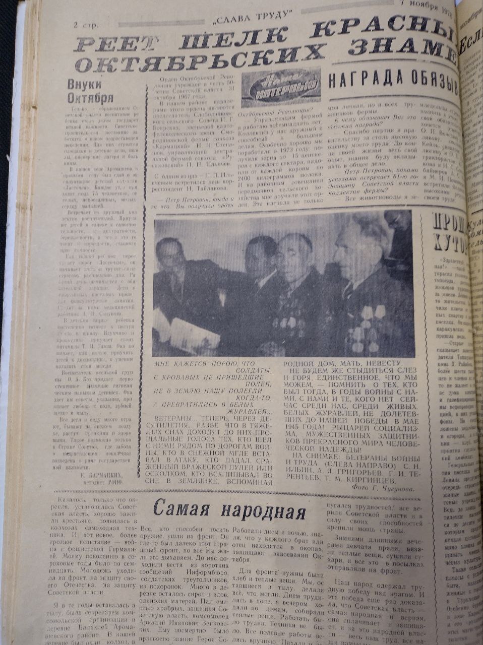 В другой публикации "Награда обязывает" Н. Тайлакова рассказывает о кавалерах ордена Октябрьской Революции, это – председатель Слободчиковского сельского Совета П.Г. Боярских, звеньевой картофелеводческого звена Смородиновской фермы совхоза "Кармацкий" Н.Н. Степанюк, управляющий центральной фермой совхоза "Русаковский" П.П. Ильичёв. Вот что рассказал корреспонденту Пётр Петрович.