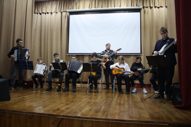 Юные любители народной музыки со своим наставником собрались в минувшую пятницу в Юрминском Доме культуры. Здесь прошла сводная репетиция к предстоящему празднику, на которой также участвовали молодые специалисты – выпускники Тобольского колледжа искусств и культуры Егор Кошкин и Владимир Зубков – руководители кружков игры на баяне, гармони и гитаре, и их ученики.