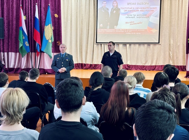 Алексей Сергеевич рассказал ребятам об имеющихся ведомственных вузах МВД России, о требованиях, нормативах и необходимых для поступления документах, а также о том, как проходит сама учеба. Кроме этого, подполковник полиции разъяснил слушателям социальные гарантии, которые предоставляются курсантам: бесплатные обучение, питание, обмундирование и проживание, денежное довольствие с первого месяца обучения, трудоустройство по специальности в органах внутренних дел, при этом период обучения засчитывается в служебный стаж.