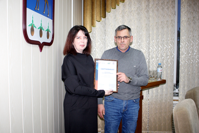Руководитель учреждения в торжественной обстановке вручила индивидуальному предпринимателю Александру Григорьеву сертификат за участие в конкурсе, который проводил департамент труда и занятости населения Тюменской области совместно с партией "Единая Россия".