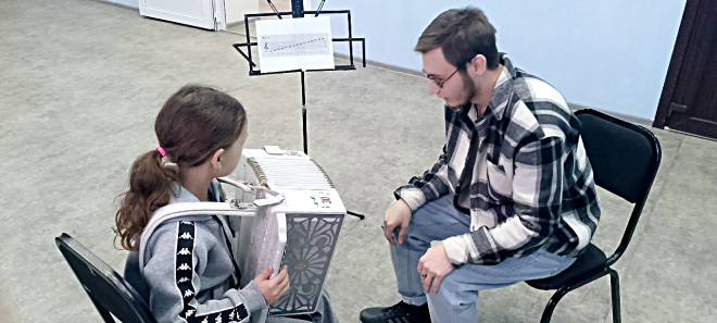 – Молодой специалист МАУК "Перспектива" Егор Кошкин занимается с нашим юным гармонистом Даниилом Кареповым с начала нового учебного года. Надо сразу отметить, что Егор с Даниилом сразу нашли общий язык, и все репетиции и занятия проходят плодотворно. Молодой наставник доходчиво и понятно объясняет новые аккорды, наигрыши. Разбирает и показывает Дане доступным языком. Для закрепления мелодии вместе с ним играет по несколько раз, чтобы запомнить. Хвалит мальчика, говорит, что он очень способный. Конечно, первым навыкам и азам научил Вадим Владимирович Плетнёв, но сейчас продолжает развивать мальчика Егор Сергеевич. К слову сказать, Даниил уже принимал участие в праздничном концерте ко Дню матери в сельском клубе "Капустник" 28 ноября. Я желаю дальнейших успехов Даниилу и наставнику Егору Сергеевичу, – отметила менеджер по культурно-массовому досугу Кармацкого Дома культуры Ирина Арканова.