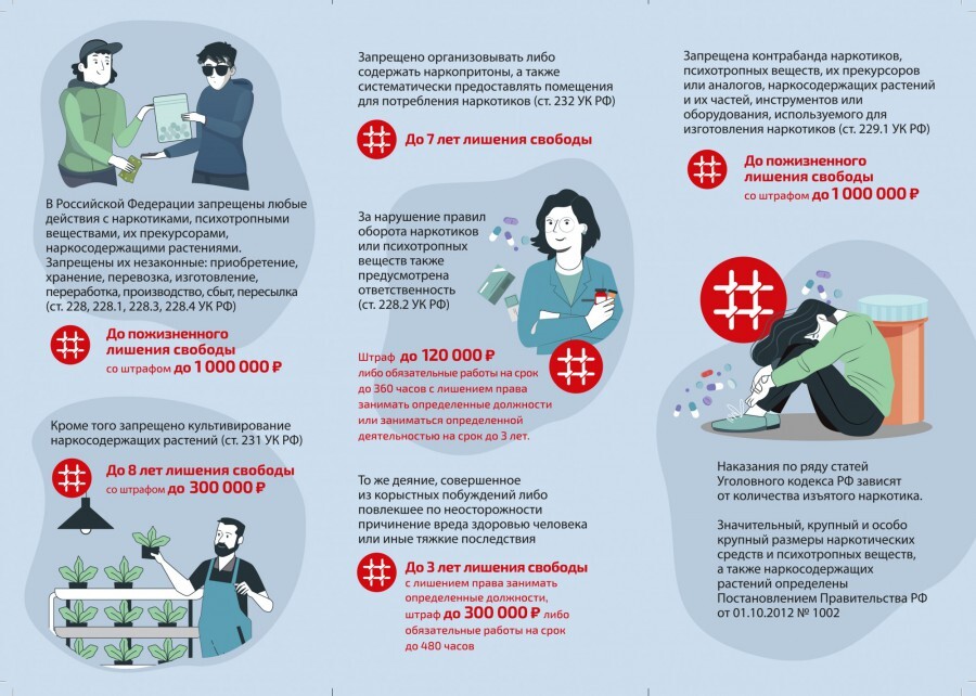 Более подробно ознакомиться с уголовной ответственностью за преступления, связанные с незаконным оборотом наркотиков, можно в тематических буклетах, подготовленных Главным управлением по контролю за оборотом наркотиков МВД России.