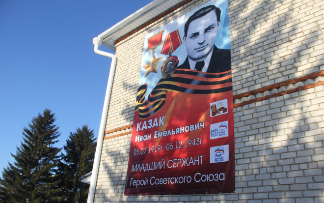 Первым местом проведения митинга стала Малиновская школа, где прошло торжественное открытие баннера: Ивану Емельяновичу Казаку, одному из Героев Советского Союза Аромашевской земли, чье фото теперь расположено на фасаде данного учебного заведения.