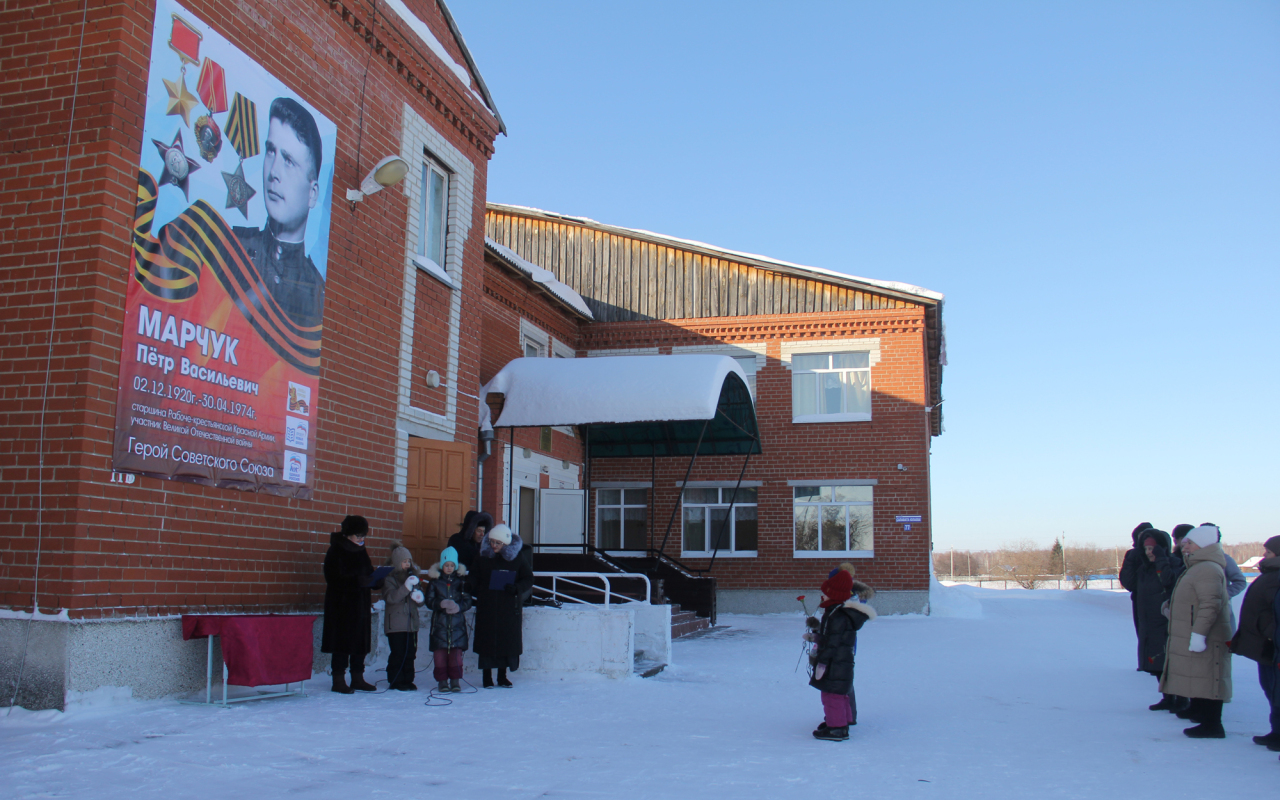 Этим же днем еще один филиал Аромашевской школы - Новоаптулинская ООШ - провел торжественное открытие баннера Герою Советского Союза Петру Васильевичу Марчуку.