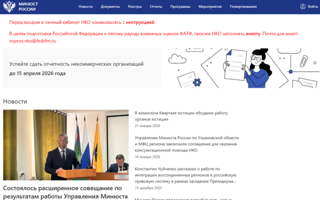- Минюст России продолжает создавать комфортные условия для работы некоммерческого сектора. В настоящее время для некоммерческих организаций полноценно заработал специализированный электронный портал. В перспективе он станет основным ресурсом, содержащим всю достоверную информацию о любой зарегистрированной НКО,- отметили в ведомстве.