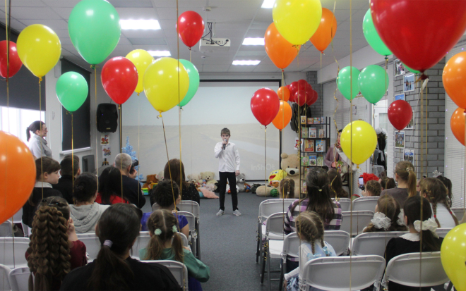 Ведущая мероприятия Татьян Знахаренко и клоун Жорик (Елена Бедель) провели для участников конкурса и их родителей настоящее путешествие по страницам книг русской писательницы.
