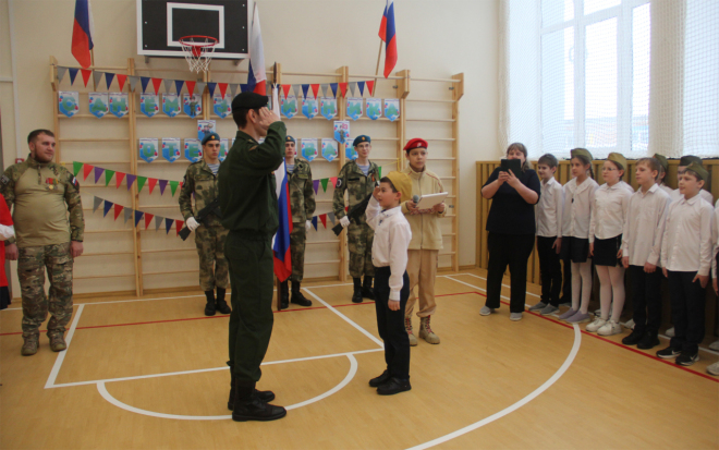 После сдачи рапортов каждым из командиров класса, перед ребятами выступил ветеран СВО, награжденный орденом Мужества, Алексей Киргинцев. Он поздравил мальчиков с наступающим праздником и пожелал им быть внимательными к учебе.
