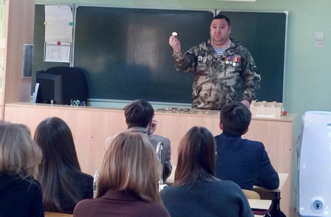 Старший инспектор по делам несовершеннолетних майор полиции Яна Крикунова совместно с ветераном ОВД Юрием Пуртовым провели урок мужества для учеников 9-х и 11-х классов Голышмановской СОШ №2.
