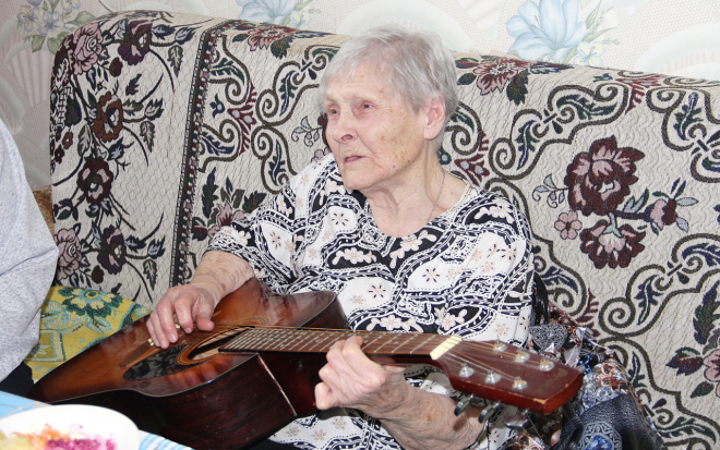 Сельчанка является ярким представителем стойких людей старой закалки. Настоящий боец, ведущий активный образ жизни, и не зря накануне её дня рождения в гостях побывала съёмочная группа областного телевидения. Как уточнила виновница торжества – это было уже в четвёртый раз. А темой разговора с телевизионщиками стало то, что она в своём почтенном возрасте оказывает помощь бойцам СВО – вяжет носки, собирает гуманитарную помощь. Героиня телевизионного сюжета для гостей исполнила песню под гитару. Несколько душевных песен в её исполнении услышали и мы.