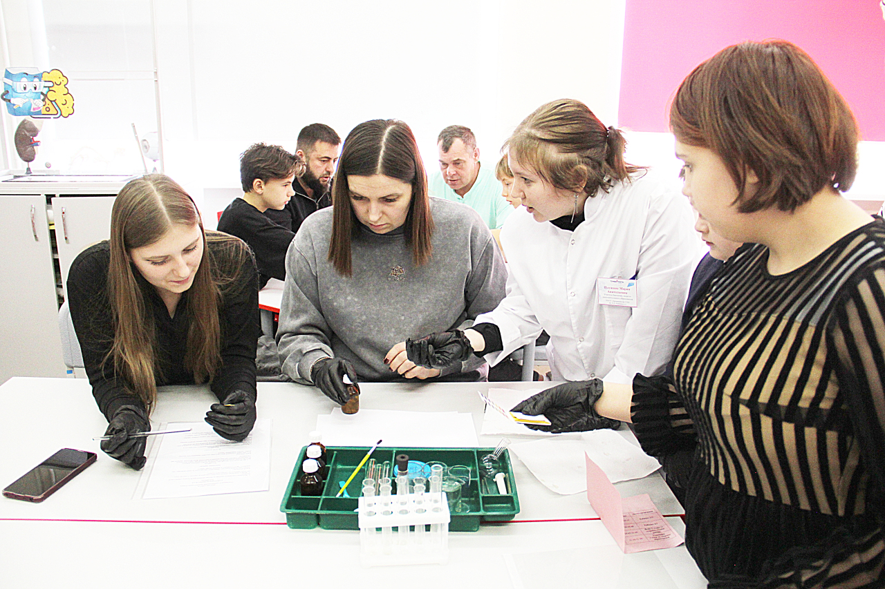 – Наша станция посвящена химическим и биологическим экспериментам. Кто-то у нас проверяет кислотность соков при помощи лакмусовой бумаги, кто-то работает с электронными микроскопами, они у нас разных видов с различной кратностью. Обычно такие эксперименты проводятся на кружках по биологии, а здесь у каждого ребёнка и родителя имеется возможность поучаствовать.