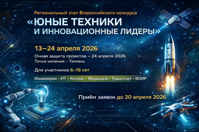 В Тюменской области начинается региональный этап Всероссийского конкурса «Юные техники и инновационные лидеры» — большой площадки для детей и молодёжи, которые уже сегодня думают о технологиях завтрашнего дня, создают собственные проекты, ищут нестандартные инженерные решения и готовы заявить о себе на серьёзном уровне. Конкурс проходит в регионе с 13 по 24 апреля 2026 года. Очная защита проектов состоится 24 апреля в пространстве коллективной работы «Точка кипения – Тюмень».