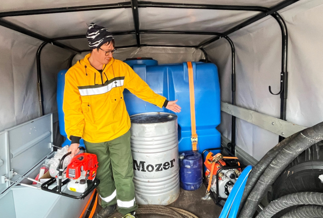- Машина оснащена: двумя мотопомпами (большой и малой мощности) - ёмкостью для воды на 2 тонны, механической лебёдкой для самовытаскивания в сложных условиях, местами для шести бойцов плюс водители с полным комплектом снаряжения в кузове. Надёжная, проходимая, всё под рукой, — делится впечатлениями механик.